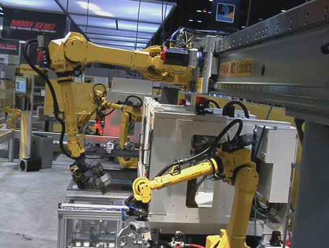 另一臺M710iC機器人安裝在地面,負責搬運已加工好的工件,送到料架。