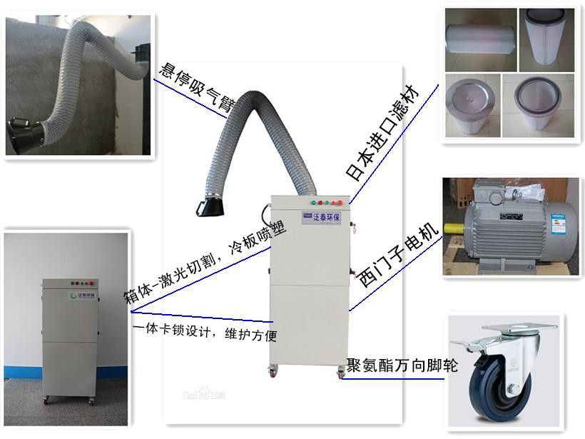 金屬焊接、激光切割、打磨作業(yè)時(shí),大量煙塵懸浮在車(chē)間內(nèi),被吸入人體肺部會(huì)嚴(yán)重影響身體健康,導(dǎo)致慢性錳中毒,電焊工塵肺病等嚴(yán)重疾病。因此必須在焊接煙塵進(jìn)入焊工呼吸區(qū)前把這些有害煙塵進(jìn)行凈化處理。 青島泛泰移動(dòng)式焊接煙塵凈化器,是一款專(zhuān)門(mén)針對(duì)治理焊接、切割、打磨時(shí),產(chǎn)生在空氣中大量懸浮對(duì)人體有害的細(xì)小金屬顆粒而設(shè)計(jì)的凈化裝置,適應(yīng)于單雙工位,它凈化效率高,輕巧靈活,配有2-3米長(zhǎng)的萬(wàn)向吸氣臂,在不同的工作地點(diǎn)移動(dòng)更方便靈活,操作方便。