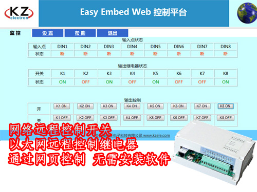 嵌入式Web服務(wù)器EA02(以下簡稱EA02),是一臺小巧而功能強大的服務(wù)器。通過以太網(wǎng)連接,在瀏覽器地址欄輸入地址(如“192.168.1.200”)則可遠程控制繼電器輸出及查看輸入觸點狀態(tài),無需安裝軟件,局域網(wǎng)、Internet均可使用。界面優(yōu)美,支持動畫、flash、音/視頻。支持二次開發(fā),用戶可自行升級。